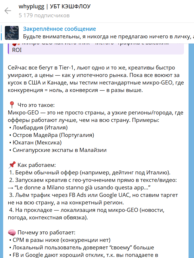 На канале в Телеграмм «WhyPlugg Убт КэшФлоу» автор рассказывает, как зарабатывает на партнерках казино с помощью арбитража трафика. В статье узнаете, стоит ли подписываться на владельца проекта и насколько полезный контент он создает.