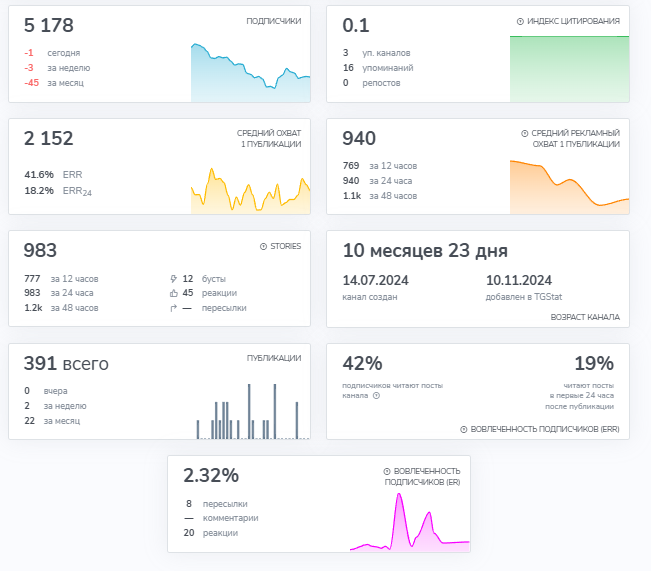 Канал создан 14.07.2024, а количество подписчиков превышает 5000 пользователей, из которых 42% просматривают посты, что может говорить о реальных показателях. До июня 2025 года выложено около 1000 публикаций, хотя выходят они не каждый день, а пользователи оставляют реакции, некоторые даже отправляют звезды, но комментарии отключены.