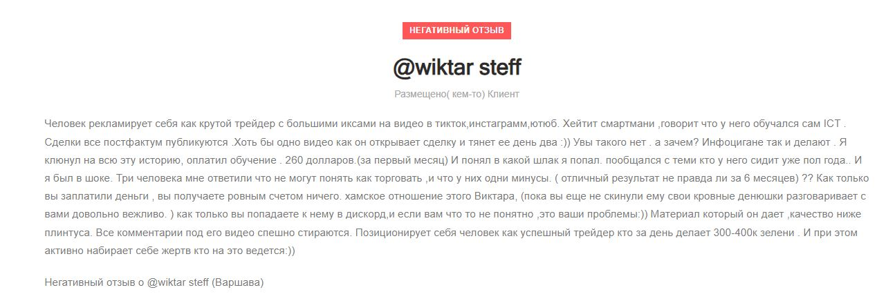 В ходе анализа репутации учебной и финансовой платформы Wiktar Steff мы нашли отрицательный отзыв. Пользователь, который попробовал услуги проекта, отмечает, что выйти в плюс по рекомендациям автора ресурса не выйдет. Помимо этого, клиент пишет про аналогичную ситуацию и у других пользователей проекта.