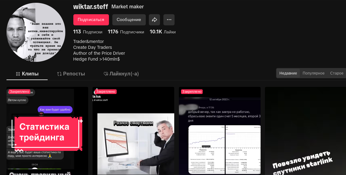 Телеграм-канала у Wiktar Steff нет. Вместо паблика в мессенджере финансовый аналитик использует тик-ток. Там у него чуть более 1 тысяч подписчиков. Активность пользователей составляет от 300 просмотров видео. Суммарное количество лайков — свыше 10 тысяч.