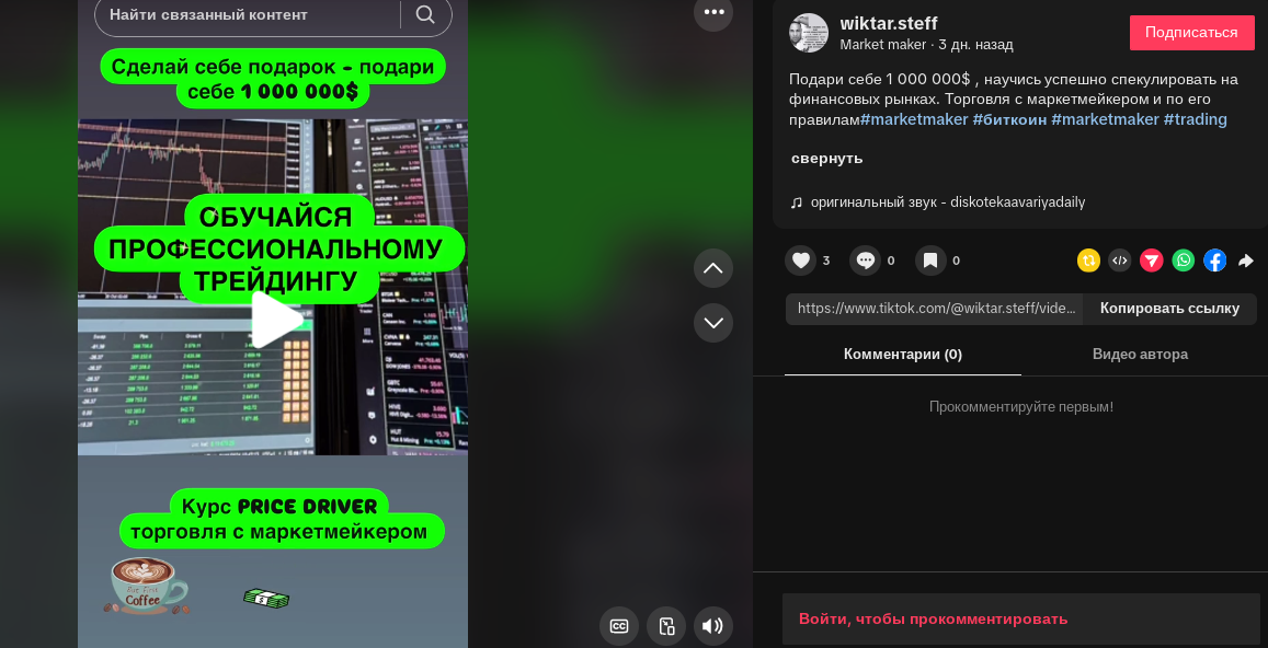 Помимо бесплатного контента встречаются рекламные посты. В таких публикациях автор платформы продвигает якобы авторский курс по трейдингу PRICE DRIVER. После завершения обучения владелец финансового ресурса обещает, что каждый заработает 1 миллион долларов.