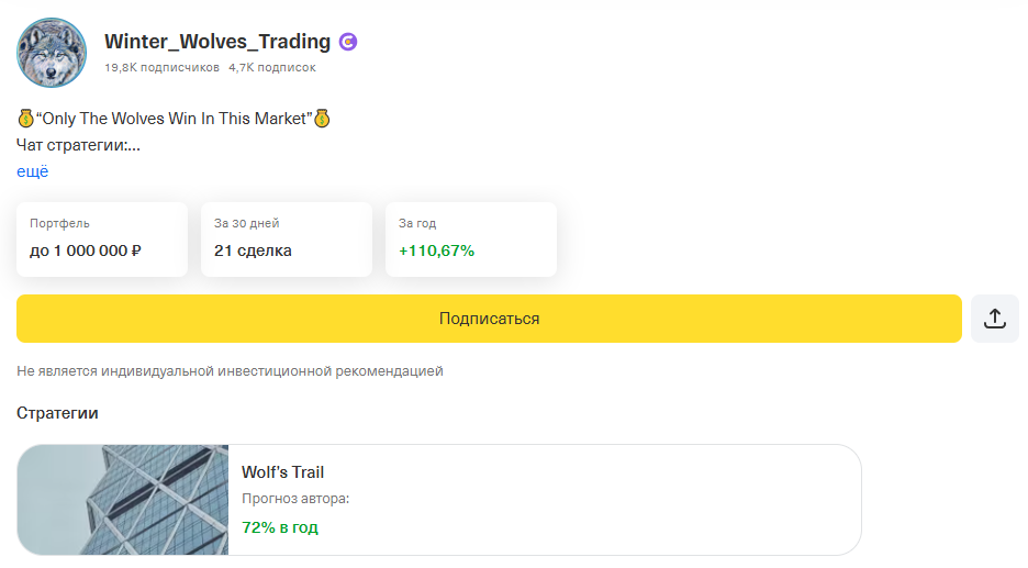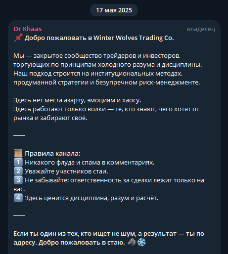 Winter Wolves Trading Co — сомнительное сообщество. Автор, судя по цифрам, реально что-то понимает в трейдинге. Правда, его стратегия вообще не работает. Пока заявленная доходность — 25%, реальная где-то в районе -25%.