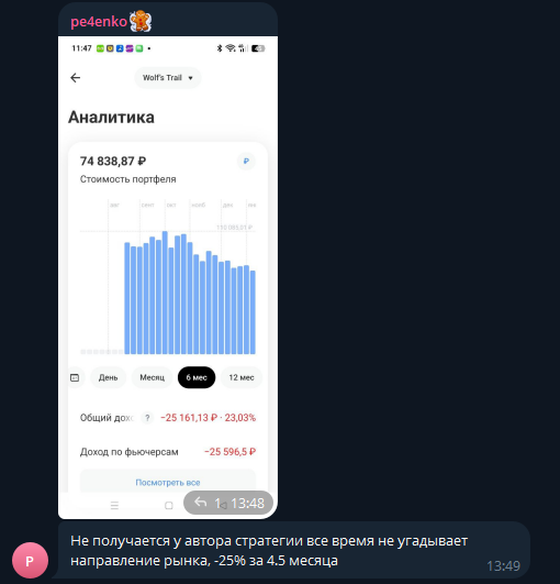 Что касается стратегии, то к ней есть определенные вопросы. Потому что люди, которые включают автоследование, получают вот такую картину. Серьезный минус за полгода. Потерять 25% от первоначального капитала — это сильно.