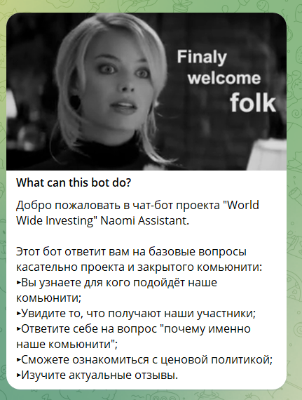 Каждый месяц автор набирает новых подписчиков для своей программы. Конечно же, на сайте не предоставлена какая-либо лицензия или гарантия для пользователей, а лишь обещания. Курс научит получать прибыль, систему чтобы легко заработать, предлагает якобы профессиональные советы от опытного трейдера в закрытых каналах. У автора есть также свой бот WWI Naomi Assistant в Телеграмм.