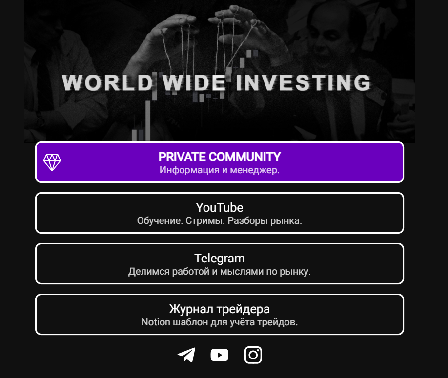 World Wide investing – курс, который продает одноименный трейдер, представленный в Телеграмм на канале с ником worldwideinvesting, в соцсети x com под ником Usd Usdt и на других площадках, в т.ч. Инстаграмм и Ютуб и поддержку пользователей через worldwideinvesting info. Платформа пытается обещать большую прибыль через их сигналы и удобную систему. Трейдер обещает возможность зарабатывать большие средства при помощи его системы, доступ в которую нужно покупать.