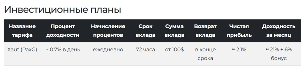 Клиентам Xau Pro предоставляется 1 тариф, имеющий гибкую доходность. Начисление прибыли происходит за 72 часа. За 3 дня вклад будет участвовать в 20 сделках. Суточная прибыль составляет 0,5-0,9%. Учитывая бонусы, доходность составляет 30% в месяц.