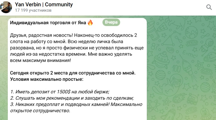 Обзор трейдера Ян Вербин: проверка телеграм-канала Yan Verbin Community на предмет скама, отзывы реальных клиентов о проекте Onlyprofitadm