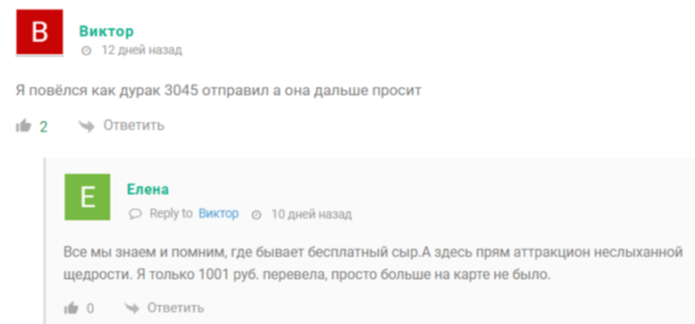Пономарева Яна Олеговна заслужила только негативные отзывы. Сначала пользователя призывают перевести небольшую сумму, которая считается доверительным платежом. Потом якобы нужно оплатить налог, комиссию банка и иные расходы. Пользователи отмечают, что, если отказаться от всего этого, Яна ведет себя неадекватно, шлет оскорбления и угрозы. Поэтому этот телеграм-аккаунт считается скамом. Положительную обратную связь от пользователей мы не обнаружили.