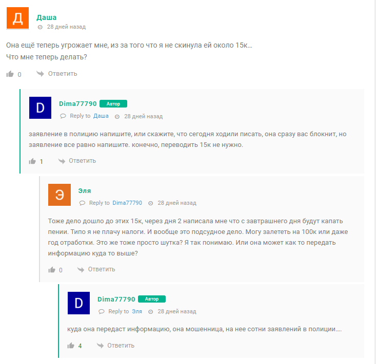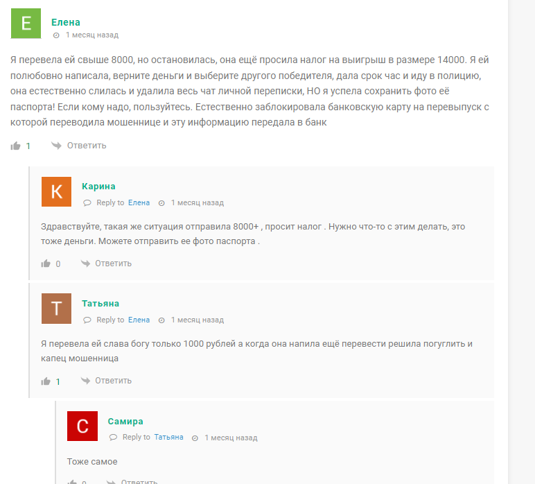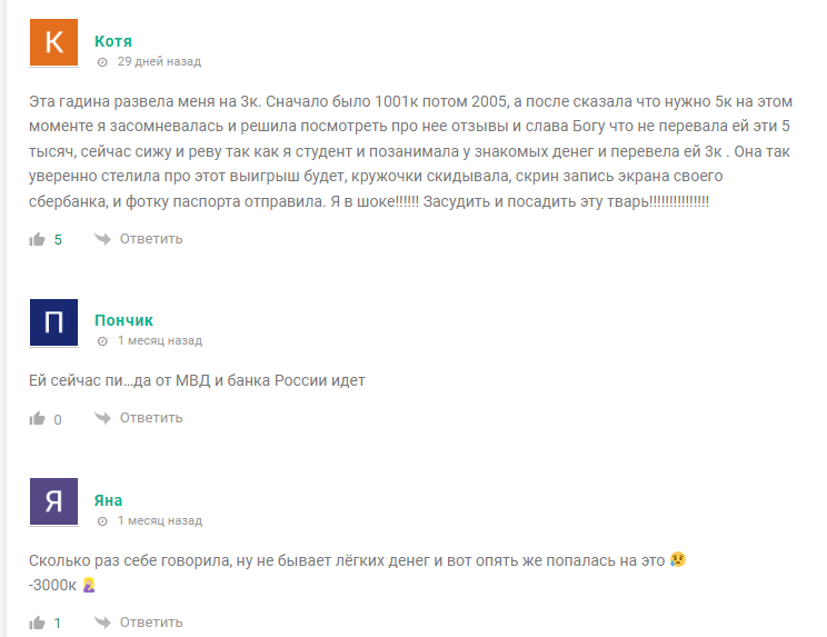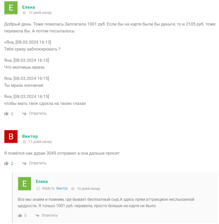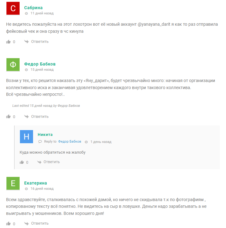Схема обмана описана в негативных отзывах о Телеграмм канале Януся Дарит. Клиент должен сначала перевести 2000 рублей в качестве доверительного платежа, затем оплатить налоги 13%, потом комиссию банка и прочие расходы. Также в отзывах о мошеннице Яна Дарит пишут, что при отказе платить девушка начинает вести себя неадекватно, оскорбляет и даже угрожает подписчикам. Очевидно, что ТГ канал Яна Дарит скам, но всегда находятся наивные люди, которые готовы поверить в щедрость трейдера.