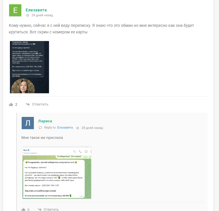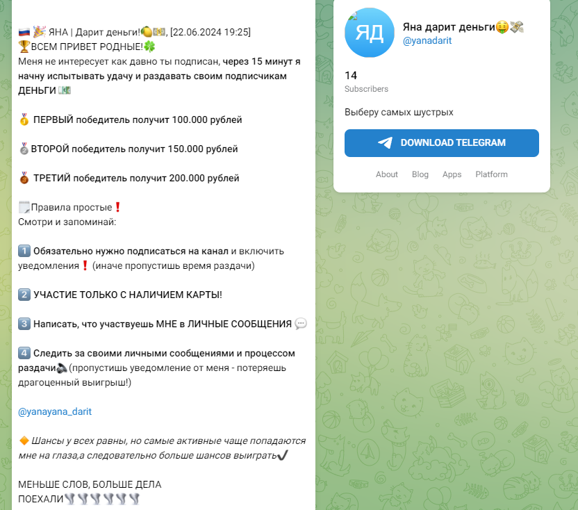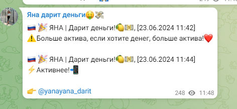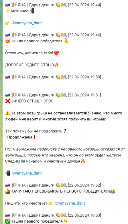 В правилах telegram канала Яна Дарит деньги прописано, что победителю необходимо будет сделать входящую трансакцию на карту девушки, чтобы банк отметил подписчика как доверительное лицо и снял с Яны ограничения на вывод средств. Это фейк, ни один банк так не работает и не убирает лимиты за входящие платежи. Смена названий канала нужна мошеннице, чтобы избежать распространения негативных отзывов. Ранее ресурс назывался: ТГ канал Яна Дарит деньги, yano4kadarit, Яна | Дарит деньги!, yanayana darit, yanadaritmoney, Яна – Дарит, Daritmoneyyanchik, Ульяна Дарит и пр.