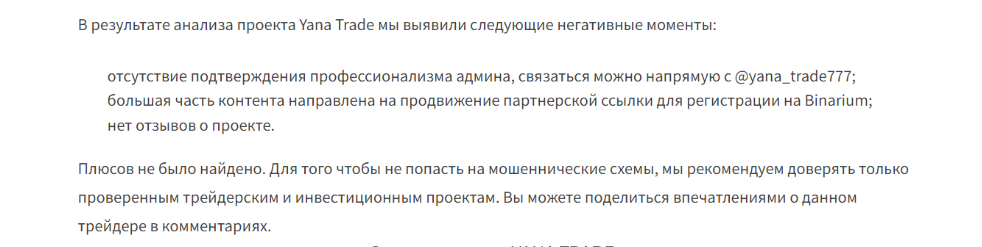 Рекомендовать услуги Яны — значит подставить вас под мошенничество. Мы же этого делать не будем, так как трейдер не предоставляет никаких доказательств честности и профессиональности. Найти верифицированную статистику успешных сделок не удалось, но зато мы готовы выделить отрицательные стороны проекта: