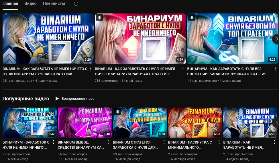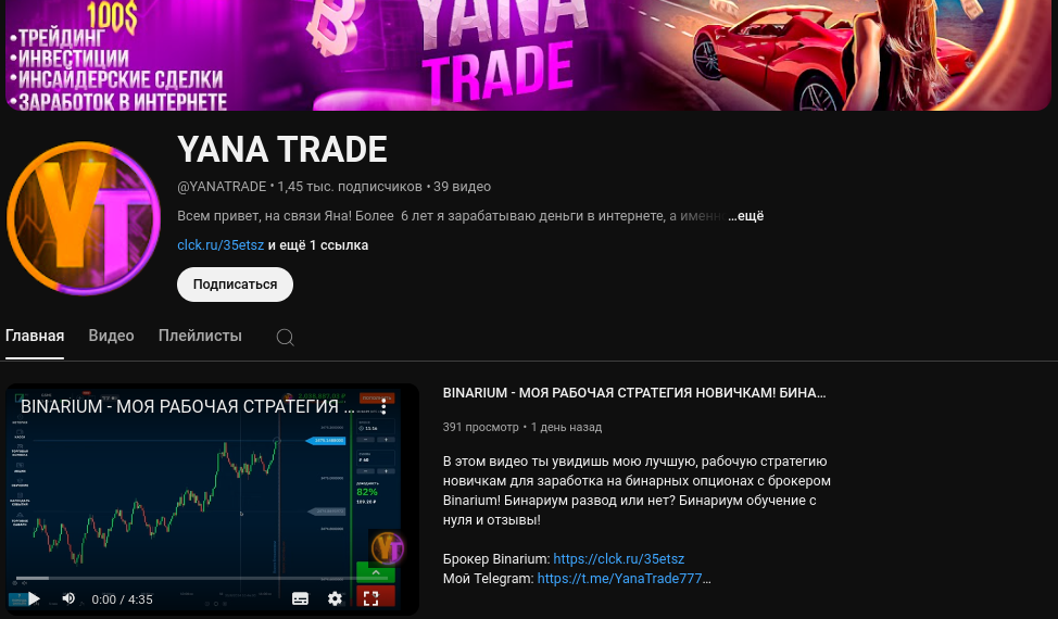 Видел я эту хрень, на канал оставил жалобу, всегда так делаю в последнее время. А то задрали уже… То Яна, то Даша, то Маша… Одна — великая бинарщица, другая — бескорыстная дарительница, третья — депозиты разгоняет до небес за два часа… Сколько можно уже херней заниматься, работать топайте!!!!