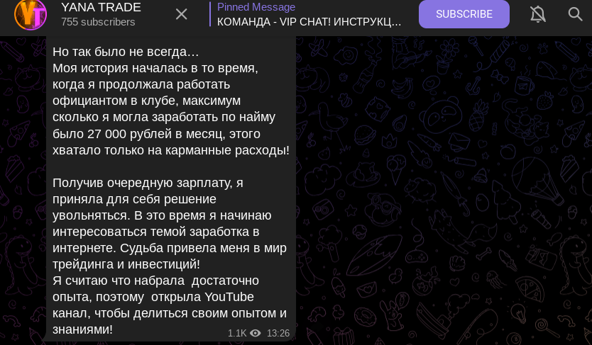 Вещание Яна Трейд в рамках телеграм-канала началось 9 сентября 2023 года. На удивление есть ознакомительный пост. В нем трейдер, как и сотни других админов подобных каналов, рассказал про сложную жизнь. Мол, до успешности Яна работала за 27 тысяч рублей по найму и вот тогда она поняла, что надо менять свою жизнь.