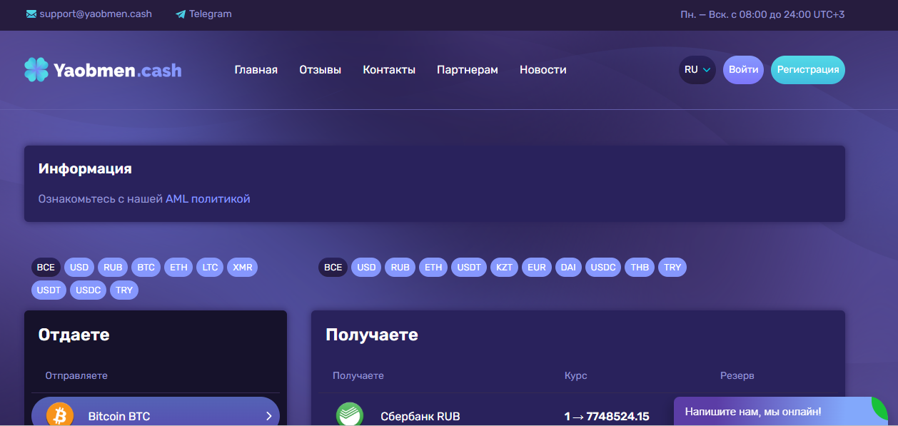 Yaobmen — это онлайн-обменник криптовалют и фиатных средств с доступом 24\7 через веб-интерфейс и Telegram-бот. Платформа позиционирует себя как простой и быстрый сервис для обмена цифровых активов и фиата без верификации и с минимальными комиссиями. Яобмен предлагает фиксированные курсы крипты, мгновенные переводы и поддержку основных токенов, таких как Bitcoin, Ethereum и USDT. В рамках нашего обзора разберём архитектуру работы обменника, проверим надёжность технических решений, оценим прозрачность тарифов и проанализируем доступность отзывов на эту тему.