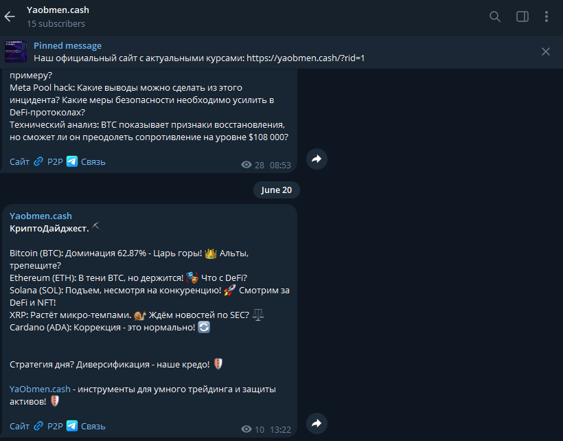 Telegram-канал @Yaobmen информирует о текущих курсах и акциях, однако активность администраторов ограничена публикацией графиков и ссылкой на официальный сайт. Интерактивных опросов или бонусных программ, как у крупных обменников, здесь нет, что указывает на менее агрессивную маркетинговую стратегию.