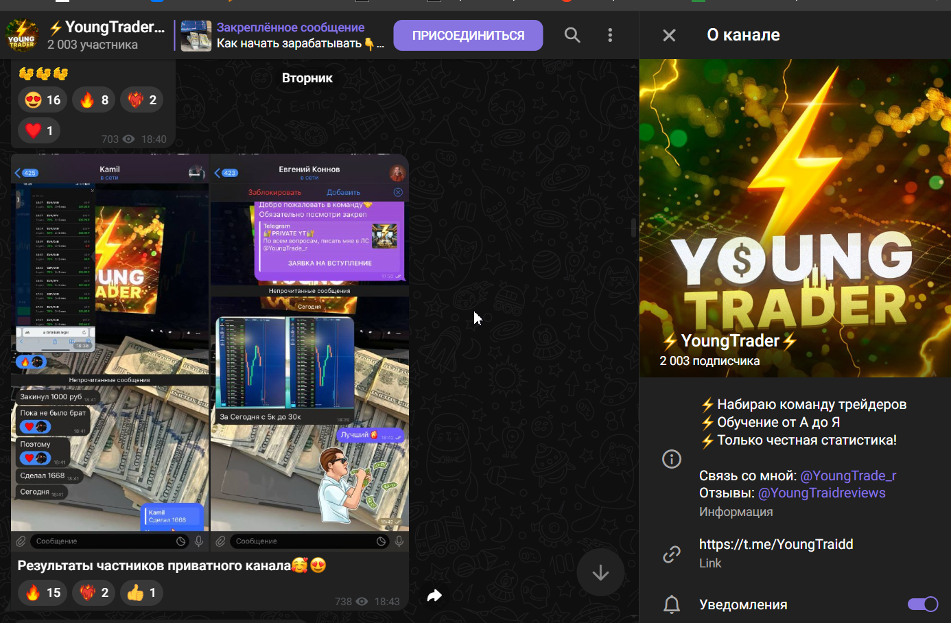 Каналы Youngtraidd в социальных сетях были созданы с целью набора в команду трейдеров. Автор обещает подробное обучение с самого начального уровня и заявляет, что ведет исключительно честную статистику торговых сделок.