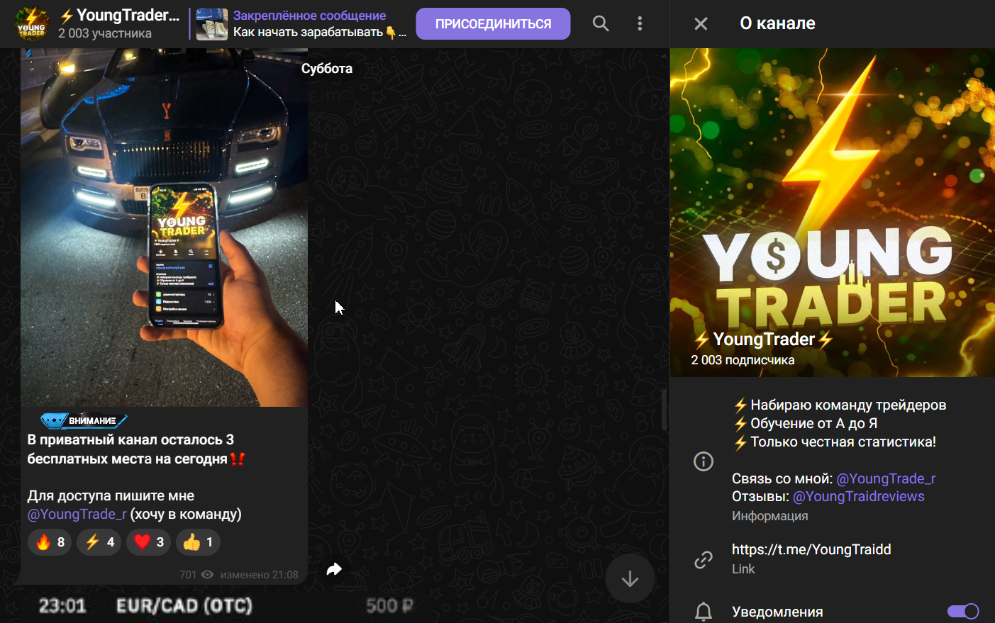Сколько денег, за какие именно услуги и какой результат — я так и не понял. Забросал канал фотками баксов и дорогих машин, типа чтоб сыграть на публику, а подписчики и ведутся на развод. Только вот отзывов в сети я не нашёл о Youngtrader.