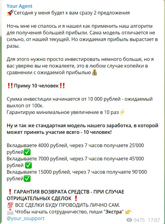 Автор рассказывает о том, что ему просто не хватает денег для больших иксов, нужно инвестировать больше. Поэтому он и приглашает инвесторов к сотрудничеству. Само собой, такие обещания не могут быть реалистичными. И если трейдер может делать такие иксы всего за 7 часов, но ему не хватает максимум 150 тысяч рублей, то понятно, что все это – обман.
