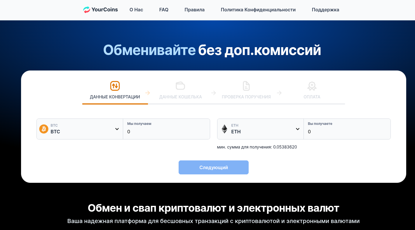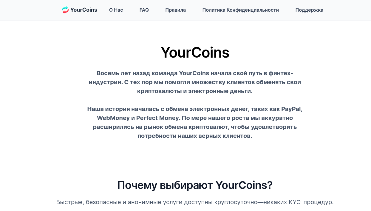 Проект yourcoins org – якобы надежный сервис для быстрой конвертации криптовалют, который, по словам анонимных создателей, работает на рынке уже восемь лет. Администрация обещает клиентам выгодные курсы, отсутствие скрытых комиссий и «сверхбыструю» обработку заявок. Однако давайте сами разберемся, насколько безопасен этот ресурс для вашего кошелька и что о нем думают опытные криптаны.
