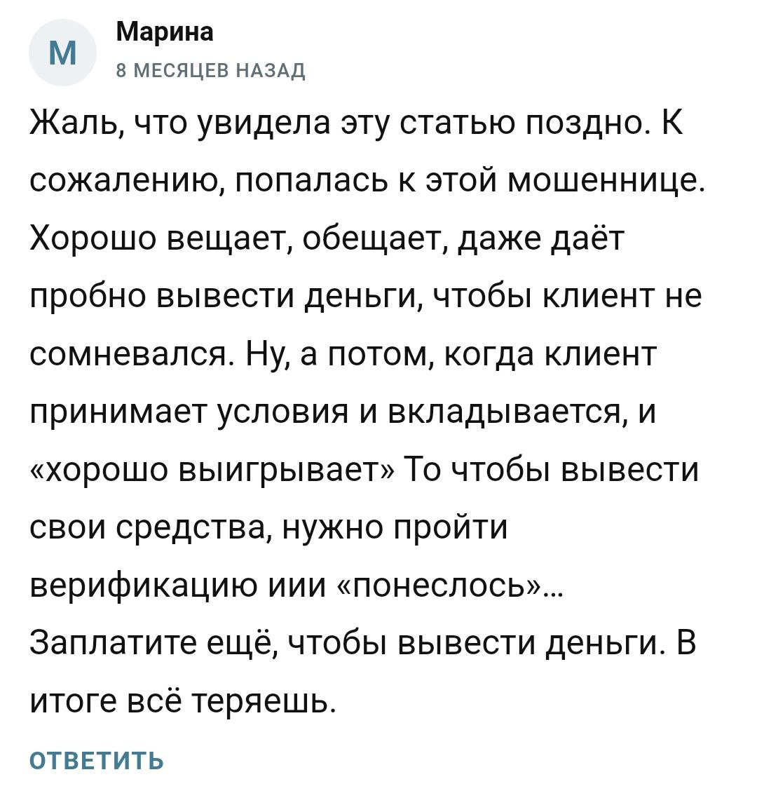 Её канал в Телеграмме был признан скамом ещё в 2023 году из-за море жалоб. Никакого образования или сертификатов у неё нет, а в интернете только негативные отзывы. Она просто мошенница, заманивающая людей обещаниями лёгких денег.