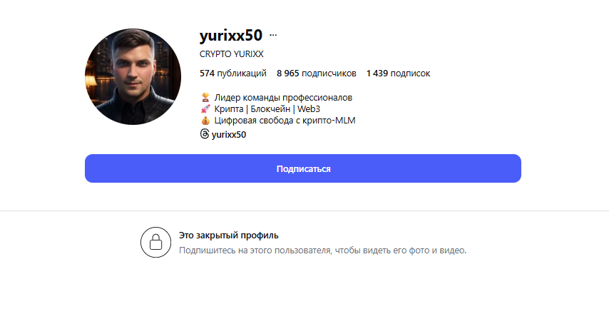 Также Юрий Мартынюк ведет инстаграм-аккаунт @yurixx50, на который подписаны почти 9 000 человек, что можно назвать внушительной цифрой. Вот только этот аккаунт закрыт от стороннего просмотра, поэтому изучить метрику проекта и определить риск накрутки не получится.