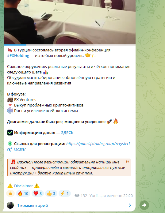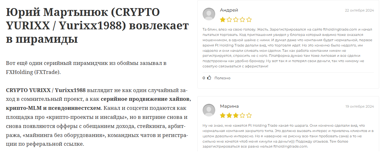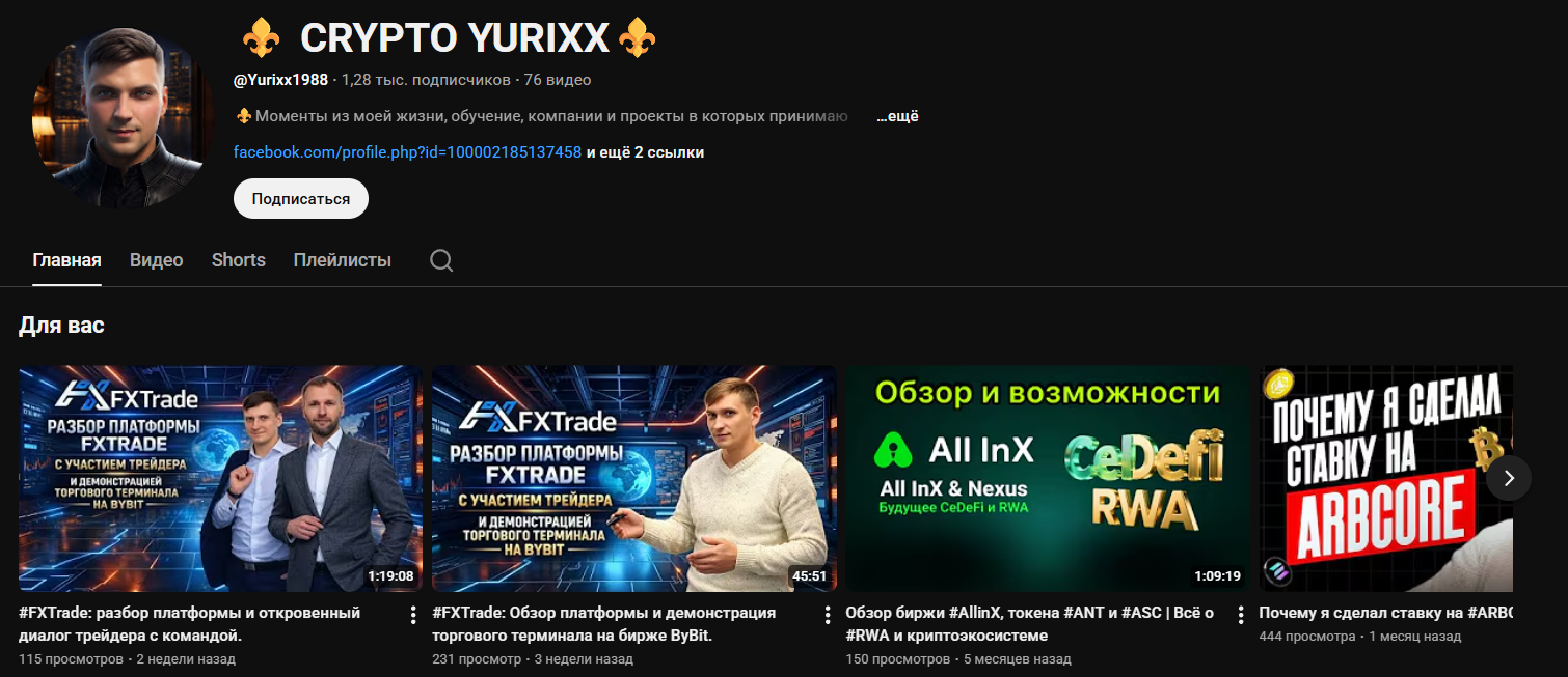 Создатель проекта YurixxTeam продвигает разные криптовалютные проекты, но не показывает свои сделки в плюс и не дает сигналы. Также он не рассказывает о настоящих методах анализа, системах для поиска активов и возможности покупать или продавать монеты с минимальным риском. Чаще всего в ленте сообщества мелькает биржа FXHolding, которая, скорее всего, является основным партнером Юрия Мартынюка.