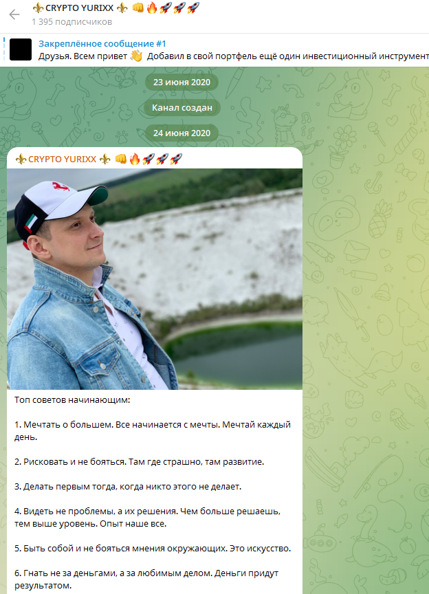 Вначале мы расскажем о телеграмм-канале Юрия Мартынюка Crypto Yurixx (@cryptoyurixx), который был создан еще в июне 2020 года. Можно заметить, что практически все публикации в ленте сообщества добавлены пересылкой или были изменены, что увеличивает подозрения в отношении проекта. В апреле 2026 года на канал подписано 1 395 человек, поэтому трейдера сложно назвать известным или успешным в продвижении.