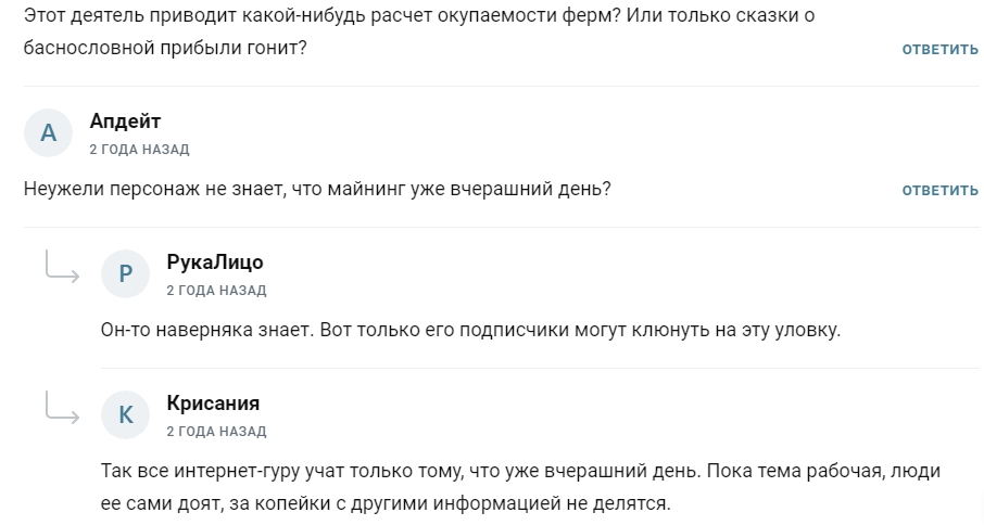 На сторонних ресурсах пользователи обсуждают предложения Дмитрия в негативном ключе, считая, что майнинг не оправдывает возлагаемых на него ожиданий по заработку, а “фермер” Дмитрий только привлекает аудиторию броскими заголовками.
