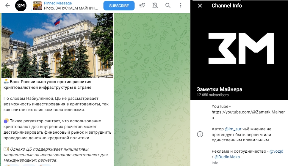 Заметки Майнера – обучающий канал на базе Телеграм о заработке на майнинге. Аккаунт автора сообщества – im sur, Дмитрий Сурин. В описании канала указано, что его мнение “не претендует быть верным или единственным правильным”. Рассмотрим, правильно ли будет тратить время на чтение канала и прислушиваться к мнению автора.