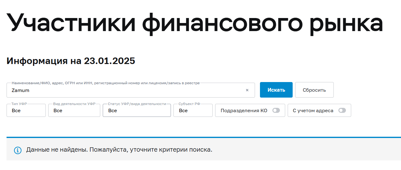 Стоит также обратить особое внимание на проверку официальных лицензий компании «Замум», так как именно эти документы докажут легальность финансовой деятельности обменника Zamum. Однако, по запросу этой организации в открытой базе данных ЦентроБанка РФ ничего не нашлось. Это может говорить лишь о том, что за средства клиентов, вложенными никто не следит. Отсутствие регуляции финансовой деятельности «Замума» вызывает сильное ощущение того, что сотрудничество с компанией не оправдает своих ожиданий.