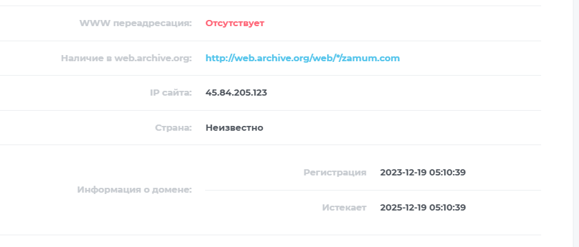 Домен обменника Zamum com впервые использовался в 2023 году. Это говорит нам о том, 25 декабря 2025 года, возраст компании еле достигает отметки в 2 года. Это означает лишь то, что она еще плохо проверена временем и любое сотрудничество с ней сейчас может вызвать неудобства или риски того, что ожидания клиента от работы не будут оправданы. Лучший вариант в такой ситуации – переждать, пока сайт станет актуальнее или популярнее.