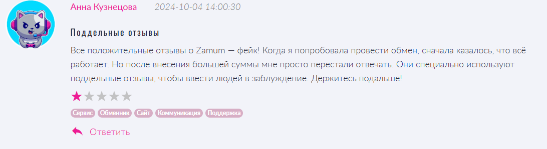 Просмотрев сторонние ресурсы, нашлось множество негативных отзывов о Zamum Support Manager. Агрессивный характер комментариев спровоцировало большое количество схем обмана, из-за которых нормальный обмен на этой платформе не был возможным. Пользователи также это отмечают и говорят, что опыт работы с «Замумом» был их худшим. Из-за этого складывается сильное ощущение того, что сотрудничество с платформой может оказаться действительно рискованной.