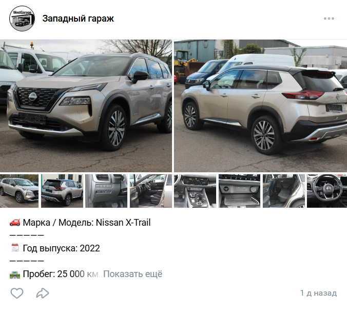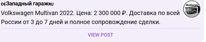 «Западный Гараж» в Телеграм и в группе во Вконтакте в основном публикует фотографии машин, которые продают авторы с кратким описанием авто и его цены. Проект собрал не очень много подписчиков, чуть больше ста.Под постами закрыты комментарии и прочитать мнение подписчиков о машинах и владельцах магазина нельзя. Лайков под постами нет и какая-либо активность аудитории в группе не проявляется. Посты никто не просматривает и не репостит.