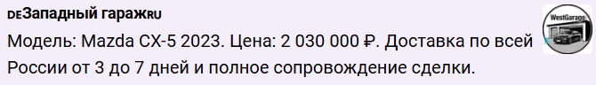 Телеграмм-канал «Западный Гараж» предлагает различные цены на машины в зависимости от марки, года производства, комплектации машин. Например, машина марки Mazda CX-5 2023 года выпуска продаётся за ₽2,030,000 с доставкой по всей России.
