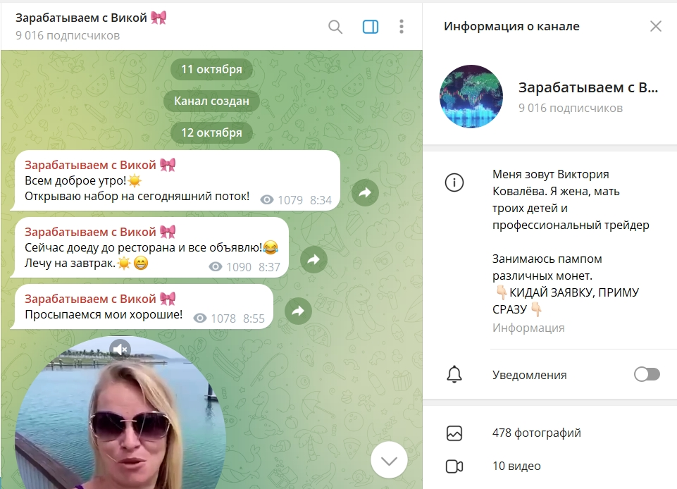 Виктория Ковалева заявляет о себе как о лучшем трейдере с командой профессионалов, которая заманивает подписчиков рассказами о пампинге монет, быстрых прибылях и гарантированных выплатах. Однако за красивыми видео с курортов и фальшивыми скриншотами вывода средств скрывается схема мошенничества. В этой статье мы разберем отзывы, схему работы и выясним, почему проект считается фейковыми.