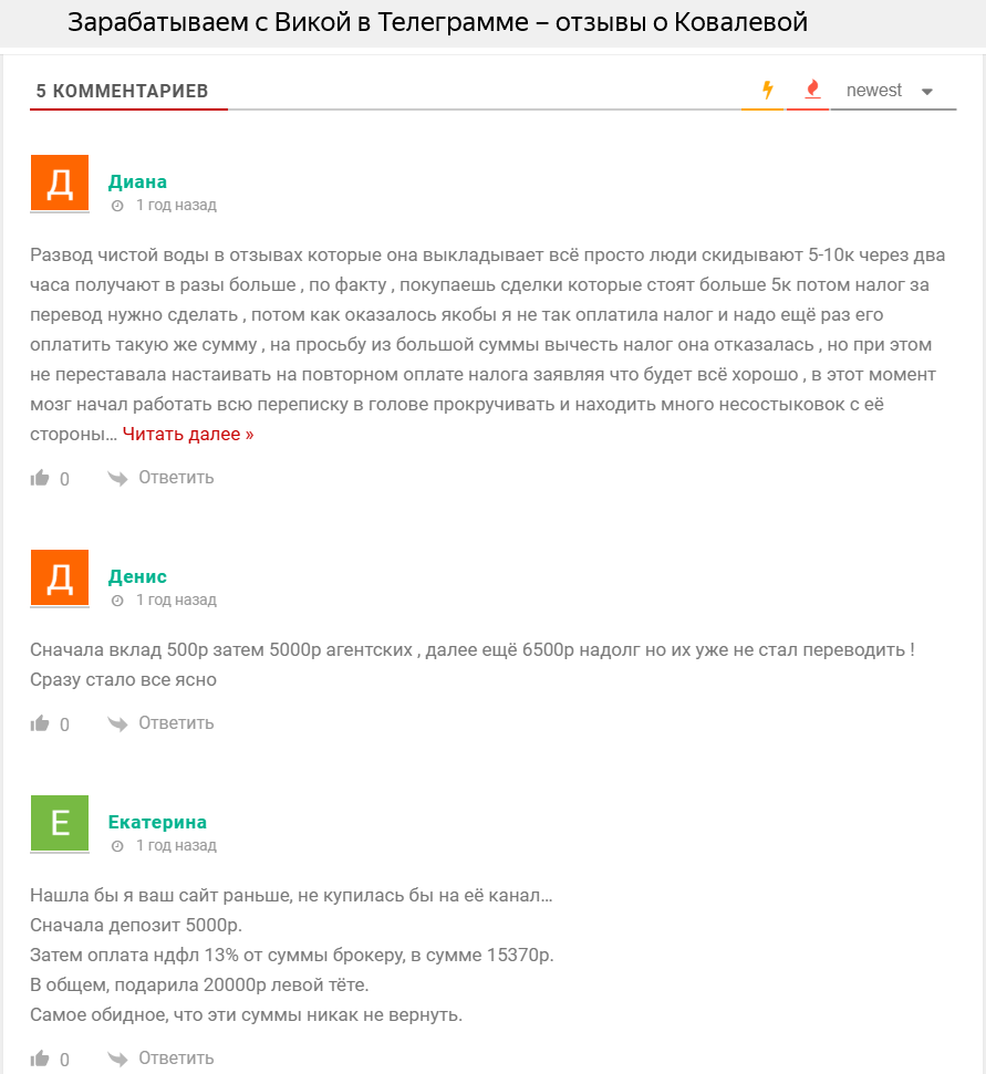 В интернете имеются негативные отзывы о Виктории Ковалевой. Один из комментаторов описывает, как внес 5000 рублей в качестве депозита. После этого участник получил сообщение о якобы заработанных 120 300 рублях. Затем клиента попросили перевести 15 639 рублей в качестве налога на прибыль. Далее начались новые требования. В итоге пользователь остался без денег.