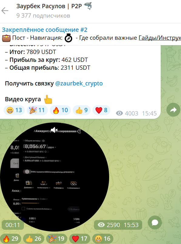 С апреля 2025 года канал резко меняет направление на арбитраж, причем трейдер утверждает, что не занимается Peer to Peer, но в названии «Заурбек Расулов | Р2Р 🦈» видно именно эту надпись. Подписчиков более 9 000, а примерно 30% из них просматривают посты, ставят 200 реакций и пишут около 10 комментариев на пост.Отзывы об арбитраже с Заурбеком Расуловым