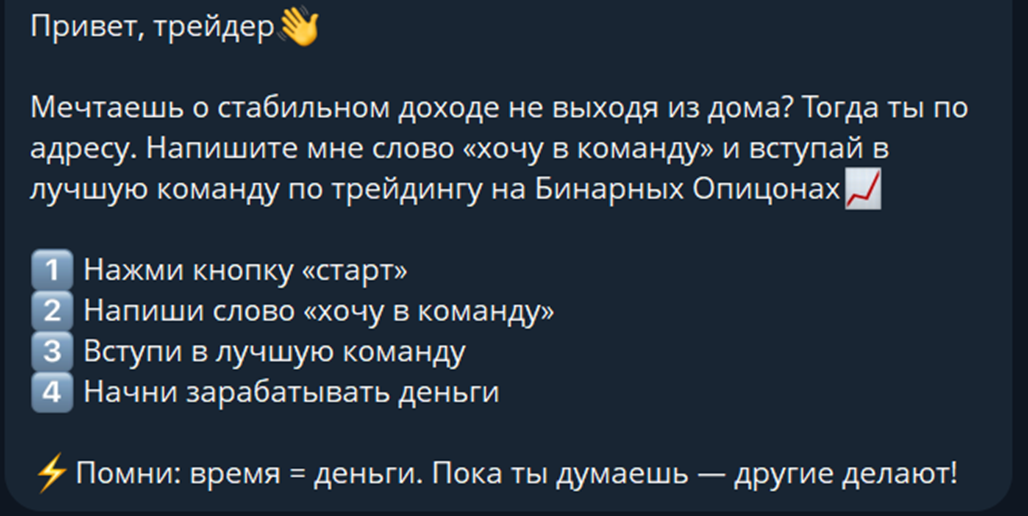 Предложения зарабатывать вместе часто встречаются достаточно часто. Для этого требуется написать в Binary Tiger Bot. Нужно активировать данный инструмент, написать «хочу в команду». После этого откроется доступ к предлагаемому способу заработку. Тут нередко применяются манипулятивные фразы, предлагающие обратиться к трейдеру как можно скорее, так как другие уже зарабатывают, пока вы думаете и т.п.
