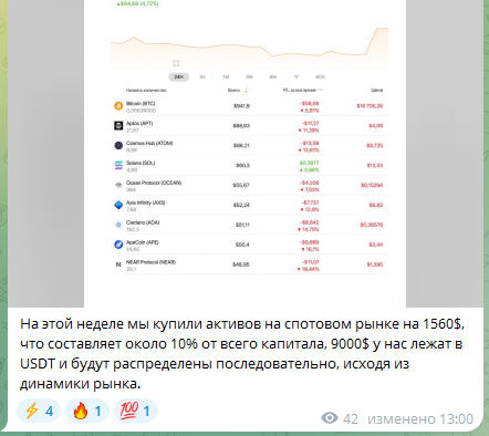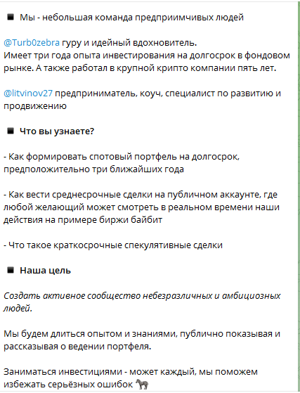 В первых постах, выходивших в паблике, администратор ресурса заявляет, что работает в команде опытных профессиональных трейдеров. Цель комьюнити – помочь подписчикам сформировать прибыльный финансовый портфель. На канале владелец обещает выкладывать примеры своих сделок на бирже «Байбит» и показывать, как грамотно вести торговлю на рынке.