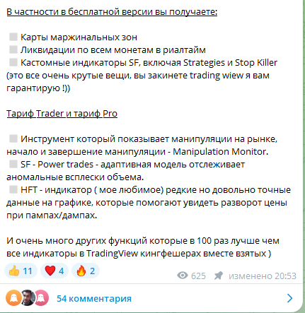 Он предлагает подписчикам перейти по реферальной ссылке и зарегистрировать аккаунт на трейдинг площадке. Тарифы, которые предлагаются в системе, включают предоставление как бесплатного функционала, так и платные инструменты. Базовую стоимость «Про» тарифа автор канала не озвучивает.