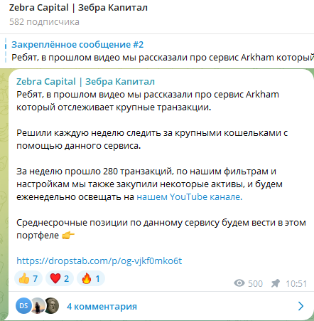 На сообщество в ТГ подписано 582 пользователя. В профиле группы указано, что в финансовом паблике можно увидеть аналитические материалы об инвестициях на средний и долгий срок в криптовалюту.