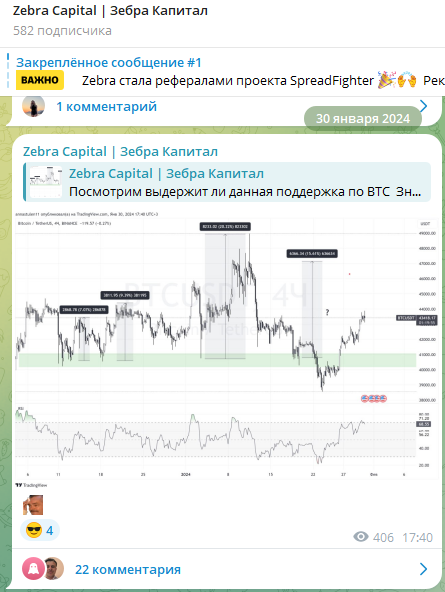 Основатель площадки приглашает подписчиков посетить Ютьюб-канал и ознакомиться с видеоразборами от известного валютного торговца. В паблике «Зебра Капитал» демонстрируются глубокие знания разработчика тг-сервиса и публикуются аналитические графики с комментариями.