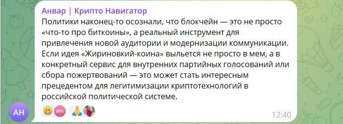Один из мелких обозревателей крипторынка посмотрел на проект с другой стороны: по его мнению, цифровой актив может стать инструментом для политиков, их работы с аудиторией и развития криптотехнологий в госструктурах.