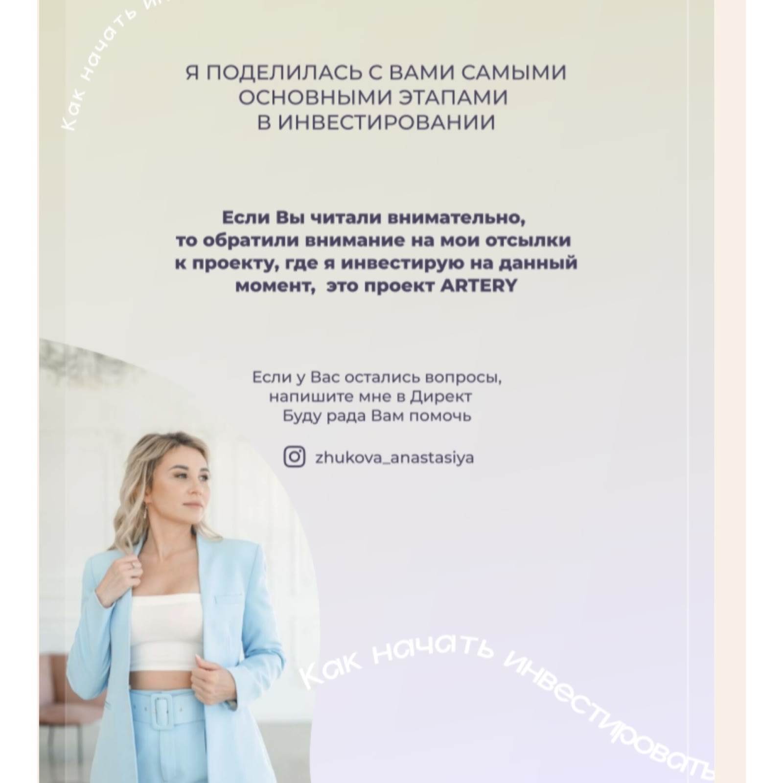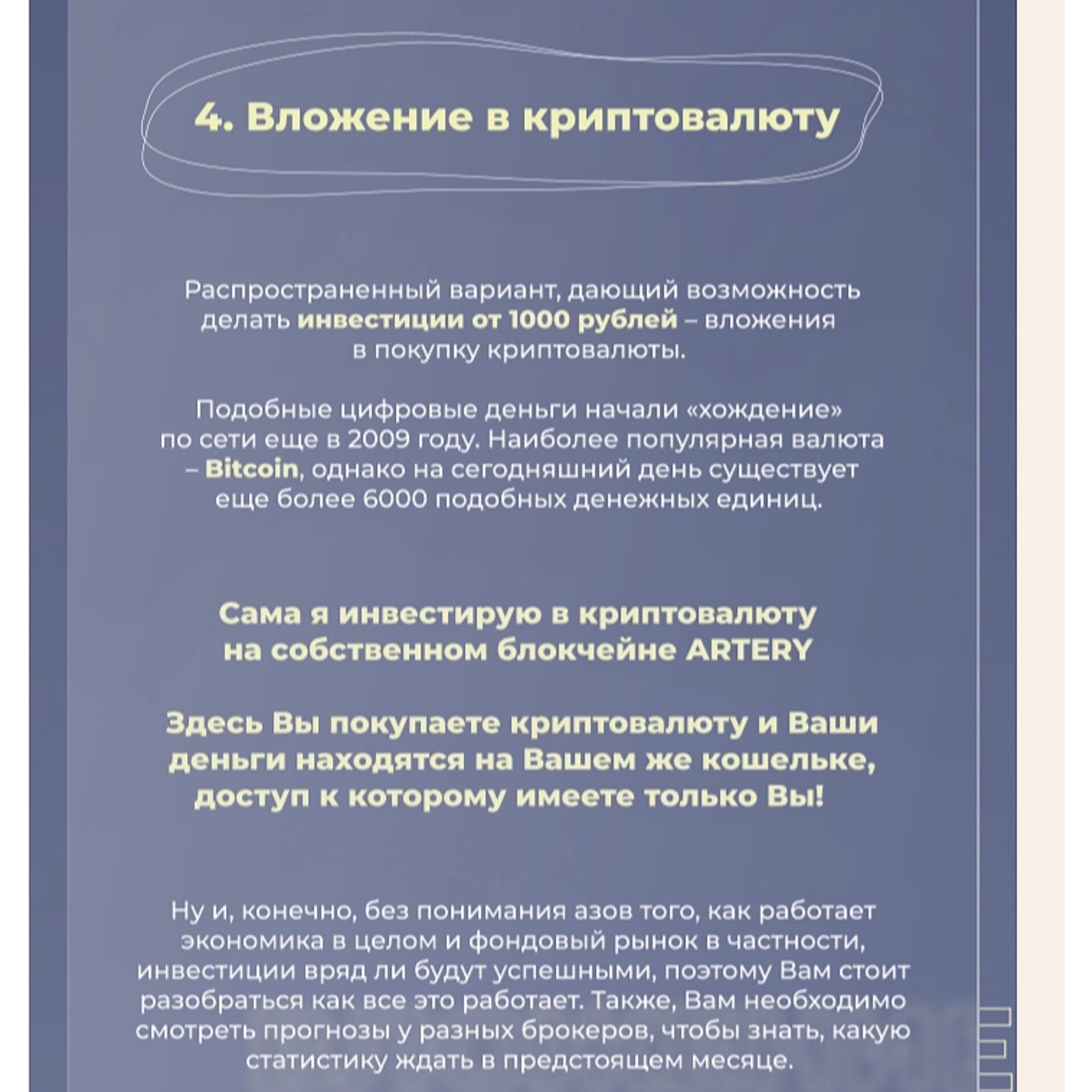 Анастасия Жукова разместила гайд по инвестициям, который представлен в виде слайдов. Исходя из информации, первым делом клиентам необходимо определиться с целями, а затем с активами, в которые будут инвестировать. Из вариантов: золото (или прочие металлы), стартапы или криптовалюты. Как пишет трейдер, она лично совершает вложения в крипту на блокчейне ARTERY, и деньги, отправленные на кошелек, находятся только у клиента. Начальное вложение — 1 000 рублей.