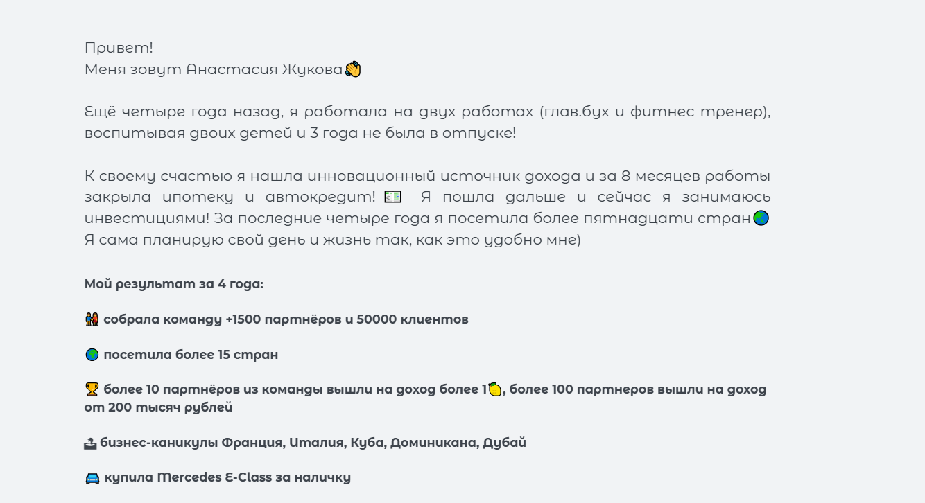 Трейдер создала статью на taplink, где разместила базовую информацию о себе. Исходя из предоставленных данных, еще 4 года назад ей приходилось совмещать две работы и воспитывать двоих детей. Со временем Анастасия Жукова научилась работать с инвестициями и нашла источник прибыли. За 8 лет, как уверяет, ей удалось закрыть ипотеку, а также кредиты. За 4 года работы с вложениями она сумела побывать в 15 странах, приобрести дорогой автомобиль. Анастасия собрала команду, состоящую из 1 500+ партнеров и 50 000 клиентов. В статье есть упоминания о том, что большая часть клиентов начала получать заработок от 200 000 рублей.