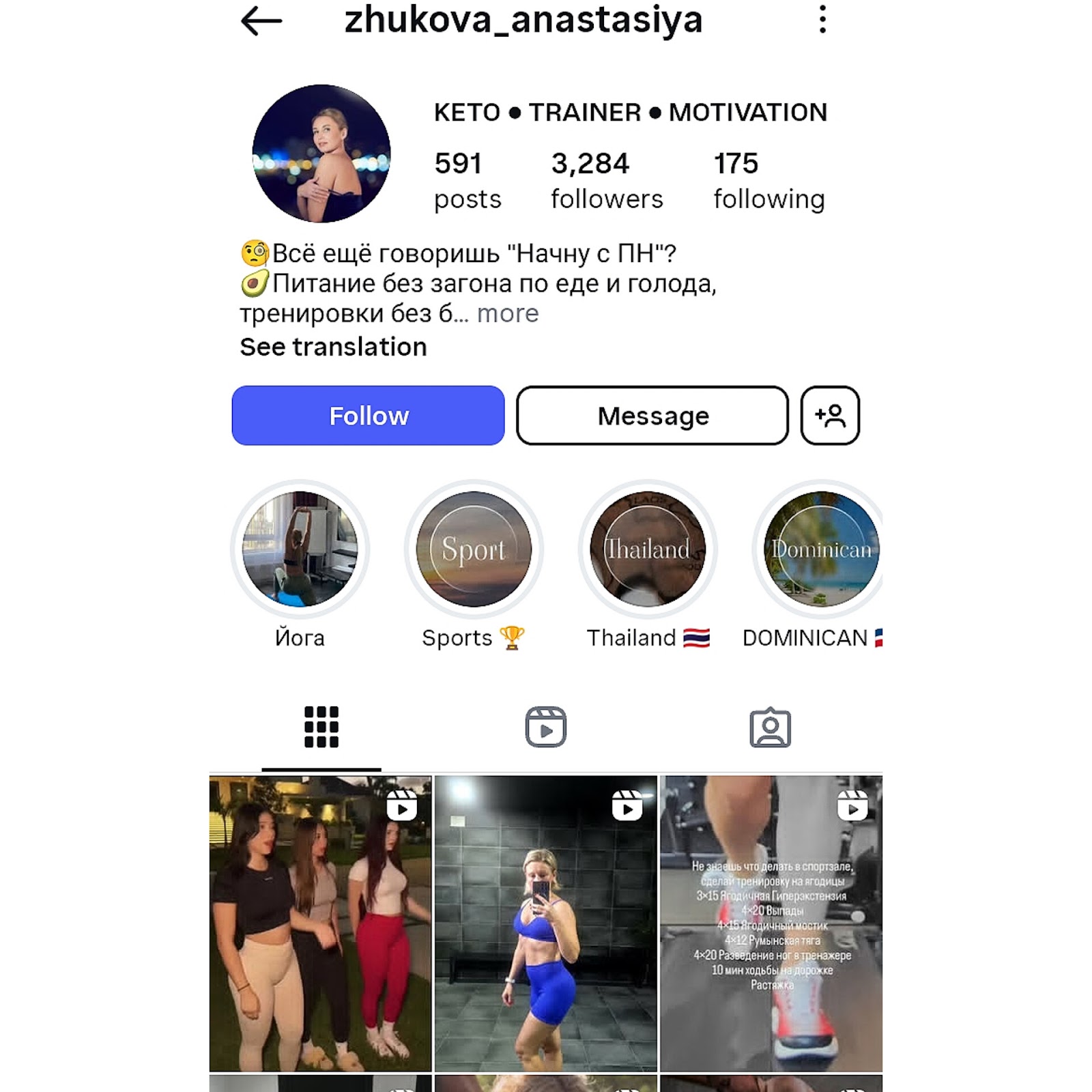 Всего выложено 591 постов, которые направлены на личную жизнь девушки и спорт. Блог посвящен правильному питанию и рекомендациям по тренировкам. В сторис размещаются фотографии с путешествий. Информации про инвестирование, а также трейдинг, здесь нет. Телеграмм канала или группы ВК на тему вложений нет.