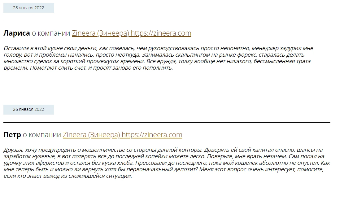 За скромное время работы в качестве торговой платформы сайт zineera com не получил позитивных отзывов. Мы не обнаружили в интернете благодарностей за выгодные тарифы, узкие спреды, быстрые сделки и т. п.