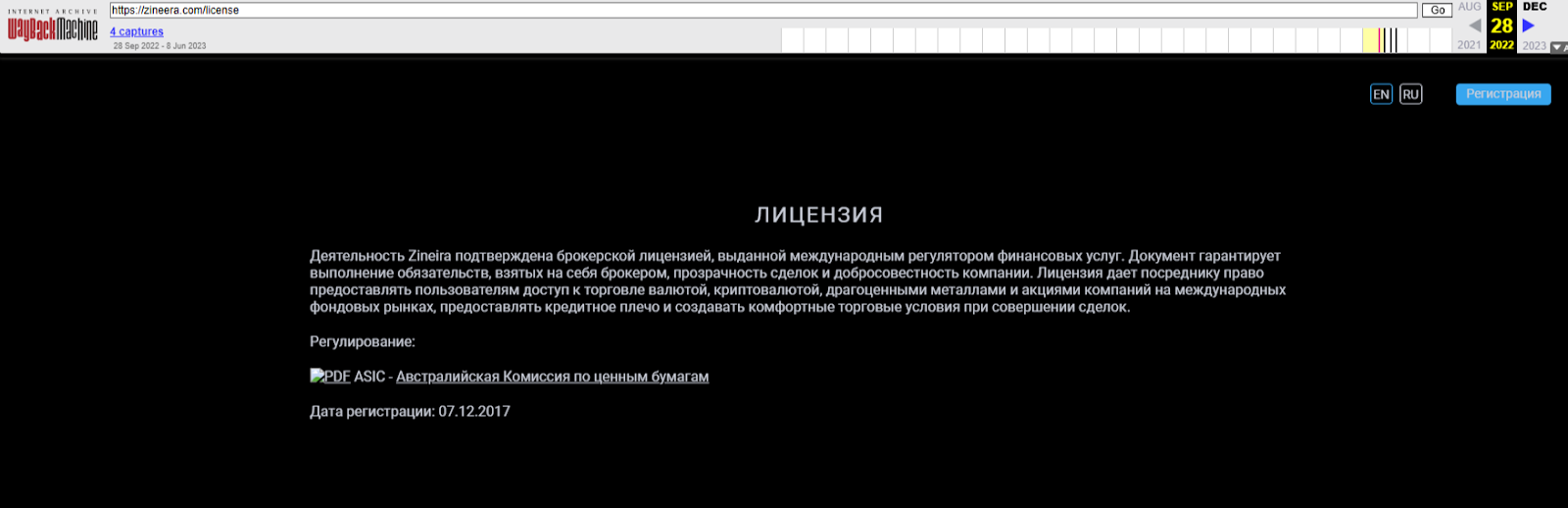 Портал криптовалютной биржи встречал посетителей формой входа/регистрации. На главной и единственной странице в футере можно было увидеть пользовательское соглашение и ссылку на лицензию. Упомянутая ссылка знакомила нас с компанией Zineera, которая имела разрешение на работу от ASIC. Дата регистрации организации 07 декабря 2017 года.