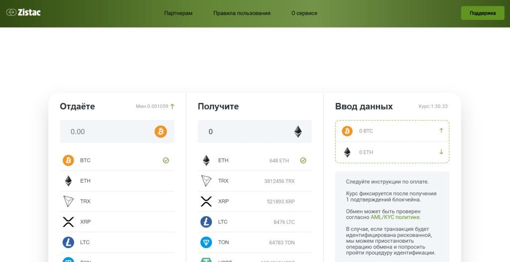 «Зистак» позиционируется как самый простой и быстрый сервис на финансовом рынке, но реальных подтверждений этому факту нет. Для обмена на Zistac доступны популярные цифровые активы, включая: