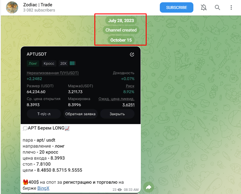 Телеграм канал Зодиак Трейд был зарегистрирован в июле 2024 года. Однако первые посты появились только в середине октября. Само название строится вокруг всем известных знаков зодиака и предсказаний, что ставит серьезность автора под сомнение.